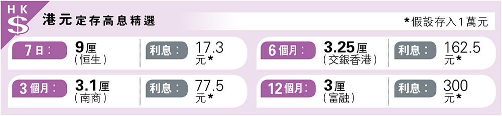 經濟 港元定存恒生7日年息高見9厘 發佈於 1 年 前 2024 年 10 月 3 日 By 明報 【明報專訊】港元定存高息精選7日高見9厘,為於恒生兌換1萬港元等值或以上外幣並開立定存之優惠年利率。 (請看附圖) 相關文章: Up Next 技術取勝:金沙上望24.7元沽壓大 不要錯過 張兆聰:內險股落後 中壽可吼 繼續閱讀 贊助商 猜你喜歡