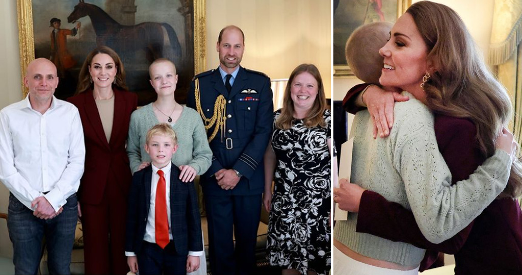 英國王儲威廉與妻子凱特周三(2日)邀請患癌的16歲少女Liz Hatton到溫莎堡見面。眾人拍攝合照,上月完成癌症化療的凱特並與Hatton擁抱。