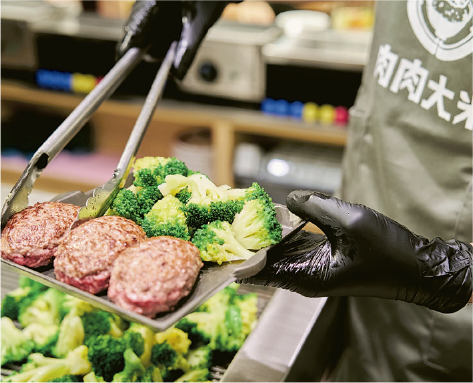 「肉肉大米」喺沙田嘅分店約有40個吧台座位,物語公司高級執行總監堀誠話,該店用由九州黑毛和牛與美國牛肉混合製成漢堡扒,又用日本東北「虹煌米」,提供新鮮現製嘅和牛漢堡扒。