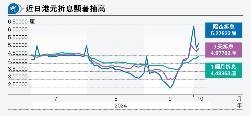 【明報專訊】雖然港股昨日結束連升6日的升勢,但是內地黃金周、北水缺席下,港股成交額仍達3100億元,外資持續湧入港股市場,港匯昨日最多一度跌87點子至1美元兌7.7718港元(1元等於1萬點子),其後回升,截至昨晚8時35分跌37點子報7.7668港元,昨日港元拆息全線上升,短期拆息升勢較大(見圖),當中與銀行之間拆借有關的隔夜拆息升29.61點子(1厘等於100點子)至5.27833厘。1個月拆息升13.89點子至4.48363厘。中長線拆息方面,3個月期拆息升13.39點子至4.50762厘。6個月期拆息升13.65點子至4.205厘。12個月期拆息升9.99點子至4.05333厘。