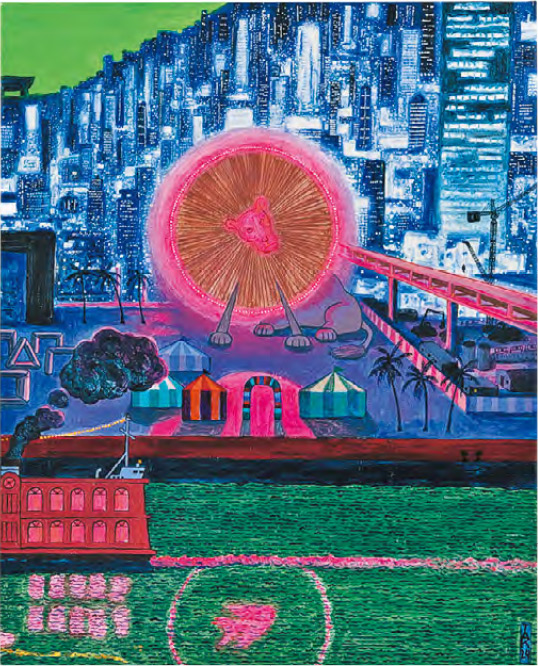 楊學德以其悠久漫畫創作為基礎,發展出獨特繪畫風,在創作中處理豐富多樣的主題:街角的荒誕事件、以動物為角色的奇幻故事等。在「老地方見」中,《隱約聽到Auld Lang Syne》、《點解嘅》等大型畫作代表了楊學德繪畫風格在近年的轉向——更為透亮明媚的色譜,更平整順滑的繪畫表面;飽滿潔淨的構圖通過超現實意味的元素,將經典香港風景浪漫化,帶懷舊意味。