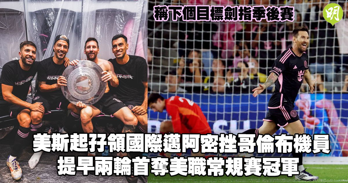 由「萬人迷」碧咸任班主之一的國際邁阿密,今晨(3日)美職憑37歲阿根廷球王美斯梅開二度以及烏拉圭籍射手蘇亞雷斯建功,作客以3:2擊敗比賽中段10人應戰的哥倫布機員,提早兩輪兼隊史首奪常規賽冠軍,亦是美斯生涯第46個錦標,他賽後表明緊接目標是劍指季後賽冠軍。