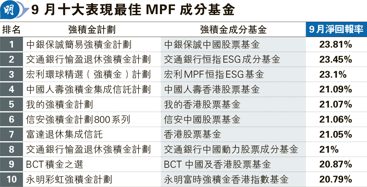 據調查顯示,以港元計算,估算9月份強積金投資收益約607億元,即475萬名強積金成員平均獲利約1.28萬元;年初至今收益約1488億元,即每位成員平均收益約3.13萬元。內地刺激經濟措施在9月份為中港股票基金帶來了約18.07%的回報,中港股票基金亦成為9月份表現最佳的強積金基金類別,中港股票基金也是第三季和今年迄今表現最好的強積金基金類別。