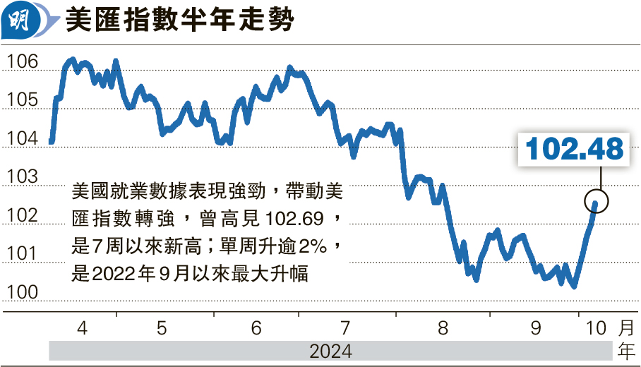美國就業數據表現強勁,亦帶動美匯指數轉強,曾高見102.69,是7周以來新高,收市升0.5%報102.48,單周升逾2%,升幅是2022年9月以來最大;歐元兌美元曾低見1.0952,為逾7周新低,最終報1.0976美元,跌0.5%。此外,美國2年期及10年期國債孳息率分別曾高見逾1個月及近2個月高位,均升至3.9厘以上。金價受壓,現貨金報每盎司2652.25美元,跌幅0.1%。