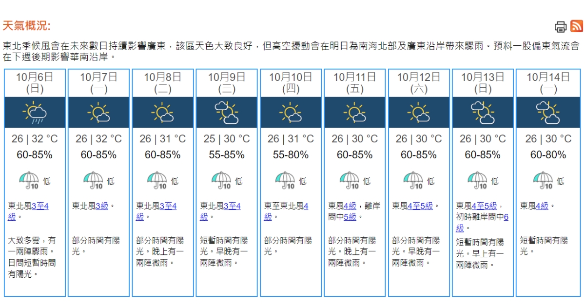即時熱點 天氣|天文台:周日有驟雨 早上最低26℃ (19:05) 發佈於 1 年 前 2024 年 10 月 5 日 By 明報 【19:05】天文台預測,本港地區今晚(5日)及明日(6日)大致多雲。明日有一兩陣驟雨,早上最低氣溫約26℃,日間短暫時間有陽光,最高氣溫約32℃。吹和緩東北風。展望隨後數日部分時間有陽光。(天文台) 【10:05】上午9時50分,天文台錄得26.6°C,相對濕度61%。 一股乾燥的東北季候風正影響廣東。本港地區今日(5日)短暫時間有陽光,日間乾燥。吹和緩北至東北風。展望明日(6日)短暫時間有陽光,有幾陣驟雨。隨後一兩日部分時間有陽光。(天文台) 相關文章:天文台天氣天氣速遞編輯推介 Up Next 加沙戰爭一年逾4萬人亡 停火無期 巴人盼望回到開戰前【短片】 (11:48) 不要錯過 天氣|天文台:乾燥短暫時間有陽光 明日有驟雨 (10:09) 繼續閱讀 贊助商 猜你喜歡 天氣|天文台:周日早上市區最低14℃ 部分地區寒冷 (17:55) 天氣|天文台:多雲有幾陣雨 今晚轉涼降至約17℃ (09:25) 【Emily】天文台「矚目天氣及氣候事件選舉」 投票有機會獲紀念品 天氣|天文台:周六多雲有雨 晚上轉涼氣溫17至21°C 下周日跌至最低14°C (21:22) 天氣|天文台:短暫時間有陽光 最高19°C (08:24) 天氣|天文台:周四多雲早晚有微雨 氣溫介乎17至20°C (20:57)
