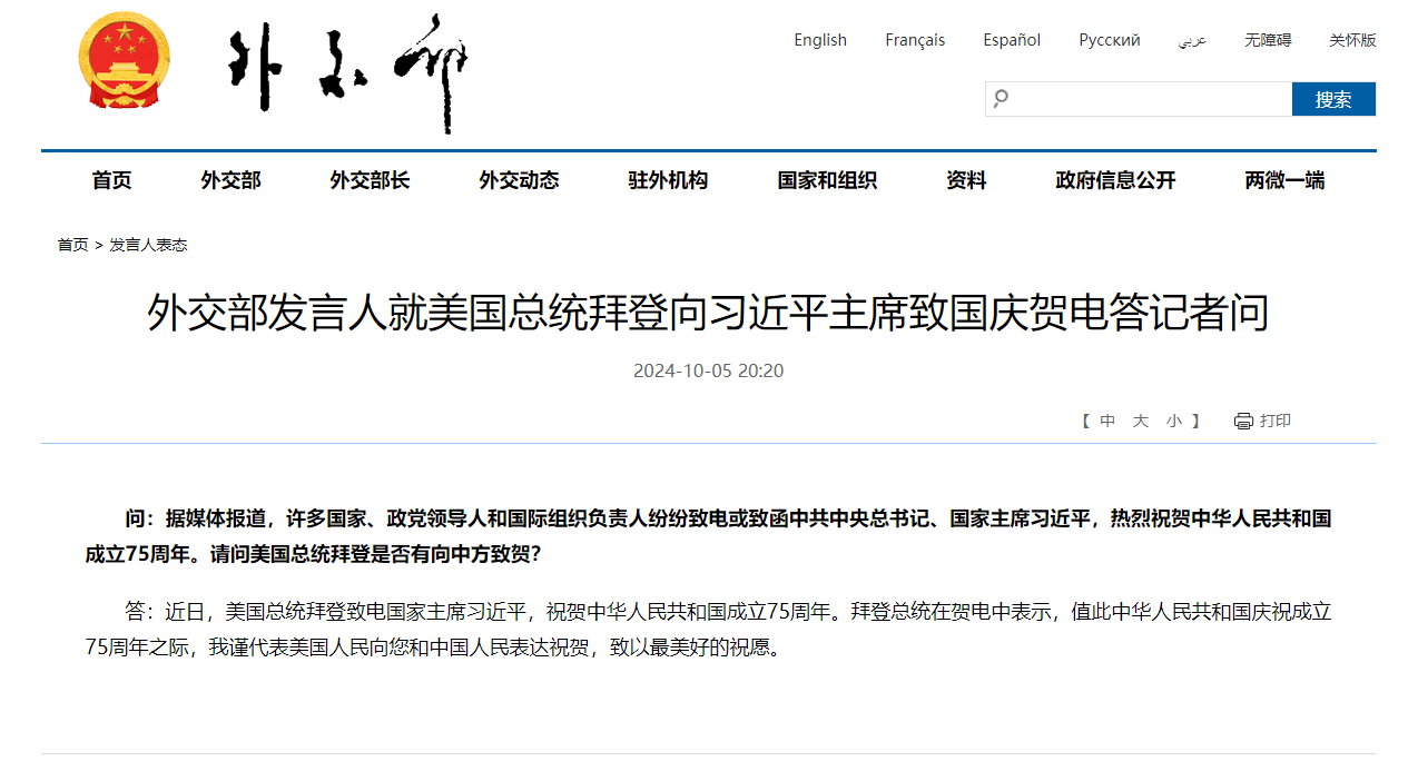 即時兩岸 拜登向習近平致國慶賀電 (20:44) 發佈於 12 個月 前 2024 年 10 月 5 日 By 明報 中國外交部10月5日通報,近日,美國總統拜登致電國家主席習近平,祝賀中華人民共和國成立75周年。 拜登總統在賀電中表示,值此中華人民共和國慶祝成立75周年之際,我謹代表美國人民向您和中國人民表達祝賀,致以最美好的祝願。(中國外交部網站) 相關文章:國慶拜登編輯推介習近平賀電 Up Next 冷空氣影響 北京今天可能飄雪 (00:55) 不要錯過 韓國對自華進口厚板產品進行反傾銷調查 (17:17) 繼續閱讀 贊助商 猜你喜歡 習近平回信天津大學師生:聚焦國家重大戰略需求 提高人才培養質量 (13:20) 特朗普:四周後與習近平會晤 大豆將是主要議題 (08:59) 俄朝領導人致賀電 魯比奧發文道賀 雙程證漢推廣滴滴高德優惠 自稱無法律風險 國慶賽馬1.3萬旅客入場破紀錄 戚繼光艦沂蒙山艦開放 父母攜兒登補山東艦遺憾