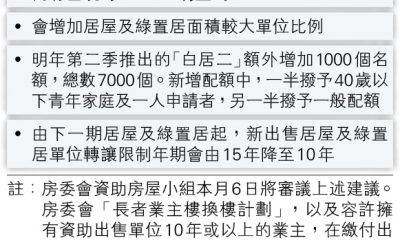 【明報專訊】特首李家超下周三(16日)發表任內第三份《施政報告》,預料交代協助青年家庭置業措施,消息稱涉優化現有政策及推出全新置業儲蓄計劃,另亦包括為多次未能中籤的年輕家庭提供額外申請編號,並研究新一批白居二配額「加碼」。