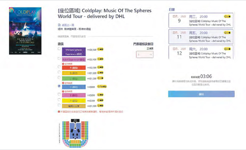 Coldplay巡迴演唱會香港站明年4月9、11及12日於啟德體育園舉行,昨首日預售。本報記者透過早前登記所得電郵,早上輪候約10分鐘後登入網站,惟3場演唱會大部分價格門票均已售罄,僅有999元及1299元門票顯示「只餘單座」或「少量」,惟因被其他顧客選購中而無法載入付款頁面。