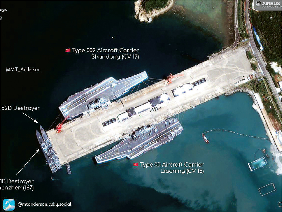 【明報專訊】解放軍海軍的兩艘航母遼寧艦和山東艦結束遠海演練後,近日同時進駐海南三亞軍港;並被衛星拍下兩艦在軍港碼頭罕見同框的高分辨率衛星圖。軍事專家對本報表示,本次兩航母同泊三亞軍港,相信將展開雙航母碼頭合練,日後再移往海上合練戰術和編隊,海軍雙航母戰鬥群將很快成型。