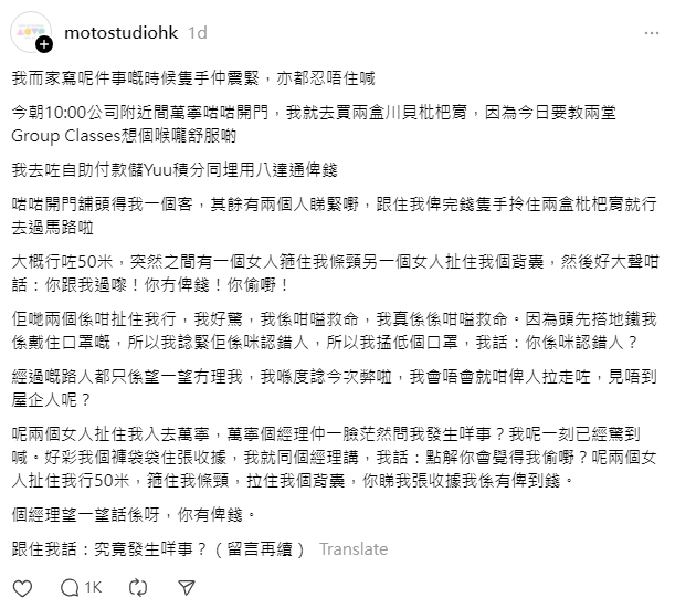 用戶「mōtō studio」於Threads發文,昨早於萬寧以自助付款形式付款,之後離開商店約50米後,突然一名女人箍頸、另一女人扯着其背囊,兩人大聲指控事主「你冇俾錢!你偷嘢!」事主形容被兩人「扯住我入去萬寧」,然後向店內經理展示付款後收據,經理之後稱兩人為「便衣保安」;其中一名女子之後搭着事主膊頭說「唔好意思啊,誤會咗你」。