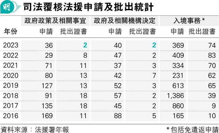 【明報專訊】法援署最新公布的2023年報顯示,署方去年內收到36宗司法覆核政府政策的法援申請,法援署批出兩宗,個案總數及比例均創2016年有分項數字以來新低。根據資料,法援署曾最高一年內批出18宗涉司法覆核政府政策的法援申請,2016至2022年批出比例平均15.6%,去年下跌至5.6%。法援署去年內也收到40宗申請法援司法覆核政府及相關機構的決定,批出兩宗,比例同是新低。