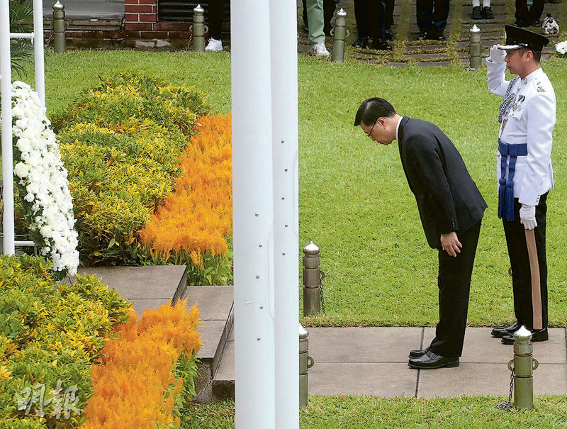【明報專訊】特首李家超率領一眾官員於重陽節到香港大會堂參與一年一度的官方紀念儀式,悼念二戰中為保衛香港而捐軀者。李家超於紀念花園獻花表達敬意,他稱要銘記戰爭中英勇犧牲的英雄和同胞,並從歷史中汲取重要教訓,珍惜得來不易的和平。