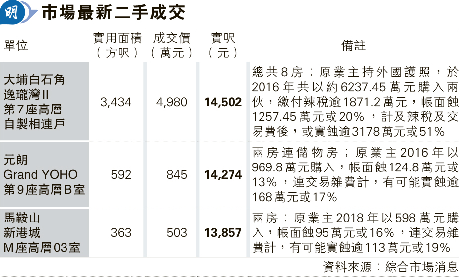 【明報專訊】美國上月減息後,發展商全速推售旗下新盤,令二手交投量、價格仍然受壓,部分新界樓盤新錄蝕讓個案;市場消息指出,近期連環錄蝕讓的大埔白石角逸瓏灣II,有業主蝕逾五成離場,相關單位為第7座高層A、B室自製相連戶,總面積共3434方呎、8房4套間隔,原業主早前以6990萬元放售,累減2010萬元或29%後,以約4980萬元易手,實呎1.45萬元。