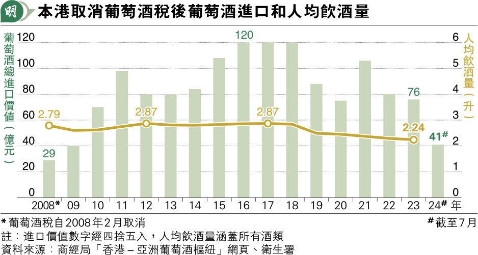 政府2008年撤銷葡萄酒稅,財政司長陳茂波昨稱此後起初市民飲酒量增加,後來逐步回落,個別年度甚至出現負增長;去年人均飲酒量與取消葡萄酒稅當年相若,當局會繼續留意情况。