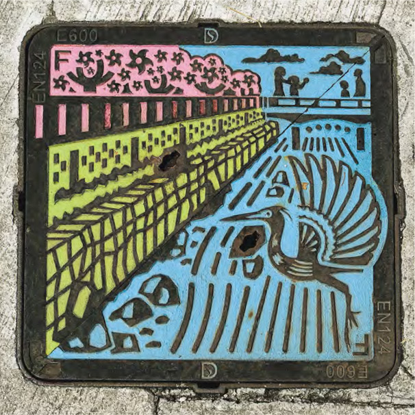 為呼應政府提升市容行動,渠務署和路政署先後在全港10多個地方安裝200多個特色渠蓋,這些彩色渠蓋大多分佈在旅遊熱點、人流高的地方,如中環港外線碼頭、大澳、林村許願廣場,又或鄰近渠務設施,如啟德河、觀塘翠屏河附近。路政署園境師莫家冀分享,路政署設計的29個特色渠蓋設置在荃灣路德圍、港鐵大圍站外及中環港外線碼頭。「這一系列設計將市民日常生活常見卻容易忽略的景色融入街道。」以大圍站外行人路的渠蓋為例,在蜿蜒的水波紋前,白鷺優雅的身影立於畫面中央,兩側點綴河畔常見的動植物,將城門河生態特色濃縮其中,「我們到大圍考察時,在城門河沿岸見到不少白鷺,故以白鷺為主題」。渠蓋以外,署方還一併美化附近路牌、升降機、橋墩等。在連接美田路與積運街交界行人天橋的升降機,不止地面設置裝飾用的特色渠蓋,升降機門也設計成觀景窗一樣,飾有白鷺身影,讓行人等候時可與白鷺對望,別有趣味。