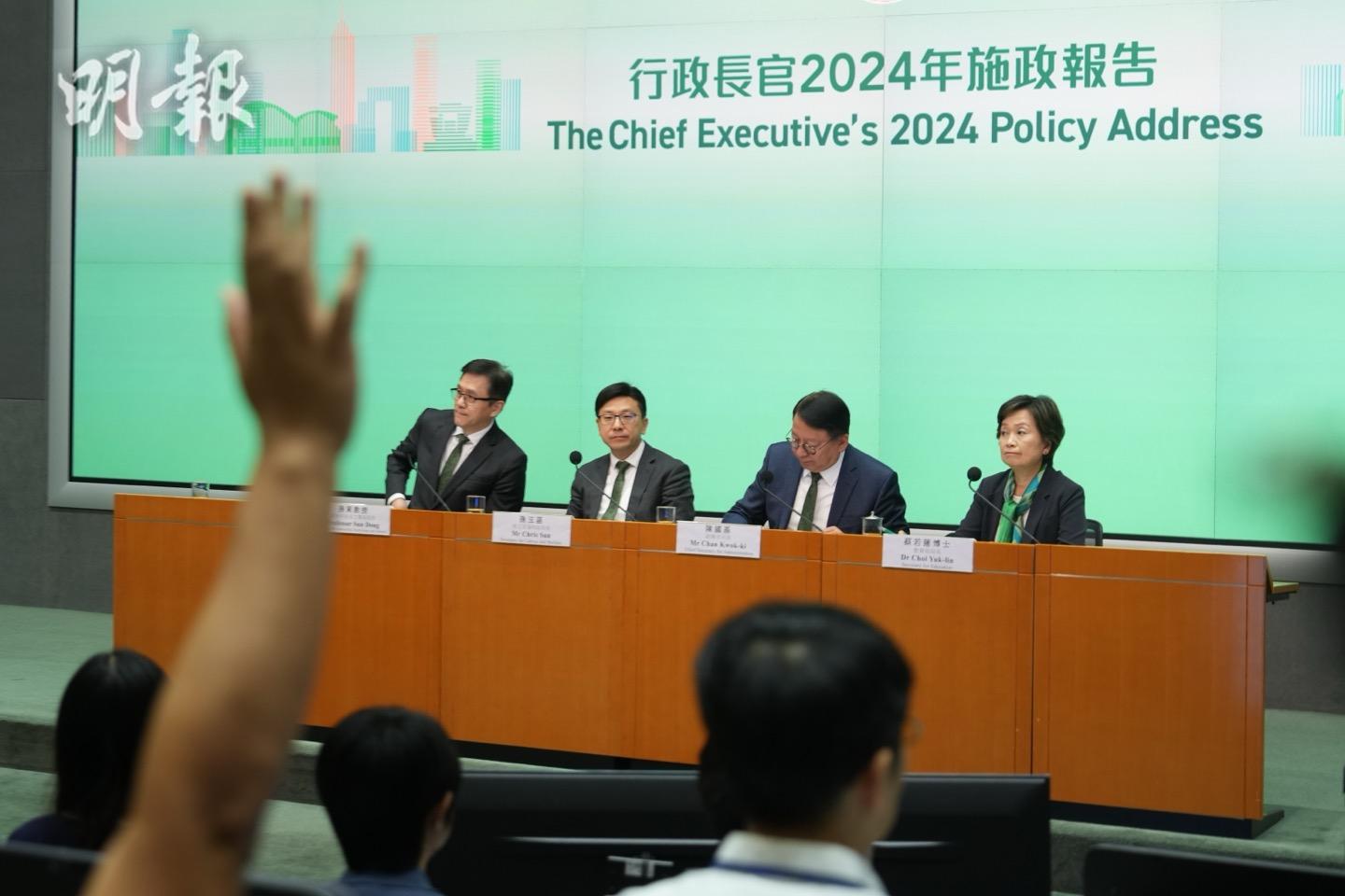 《施政報告》提出調整各項輸入人才計劃,政務司司長陳國基強調,主動邀約人才的措施可「百分百對接香港需要的人才」。至於邀約人才的選擇,將由「教育、科技及人才委員會」商定,又稱好的人才沒有定義,「有定義範圍就收窄咗」,局方或會與業界企業聯絡了解人選。孫玉菡則表示,好的人才未必主動願意來港,強調要「三顧草廬」、「禮賢下士」,他又強調留人才亦重要,稱特首訂KPI要求2025至2027三年內年均為5萬人才續簽。此外,孫玉菡表示,11月起將放寬非本地本科生在港兼職限制,希望可令本地市場有更多選擇。