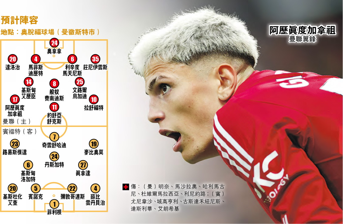 【明報專訊】英超第8輪今晚展開,率先上演的7場比賽中,勢以曼聯主場迎戰賓福特最受關注,事關「紅魔」已淪落至排第14位,早前在會方董事會「逃過一劫」的主帥坦夏格,仍被外界視為被炒大熱門。而禍不單行的是此役球隊因傷病可能缺陣的球員最多達10人,或令賓福特可相隔87年,再度由奧脫福球場凱旋。