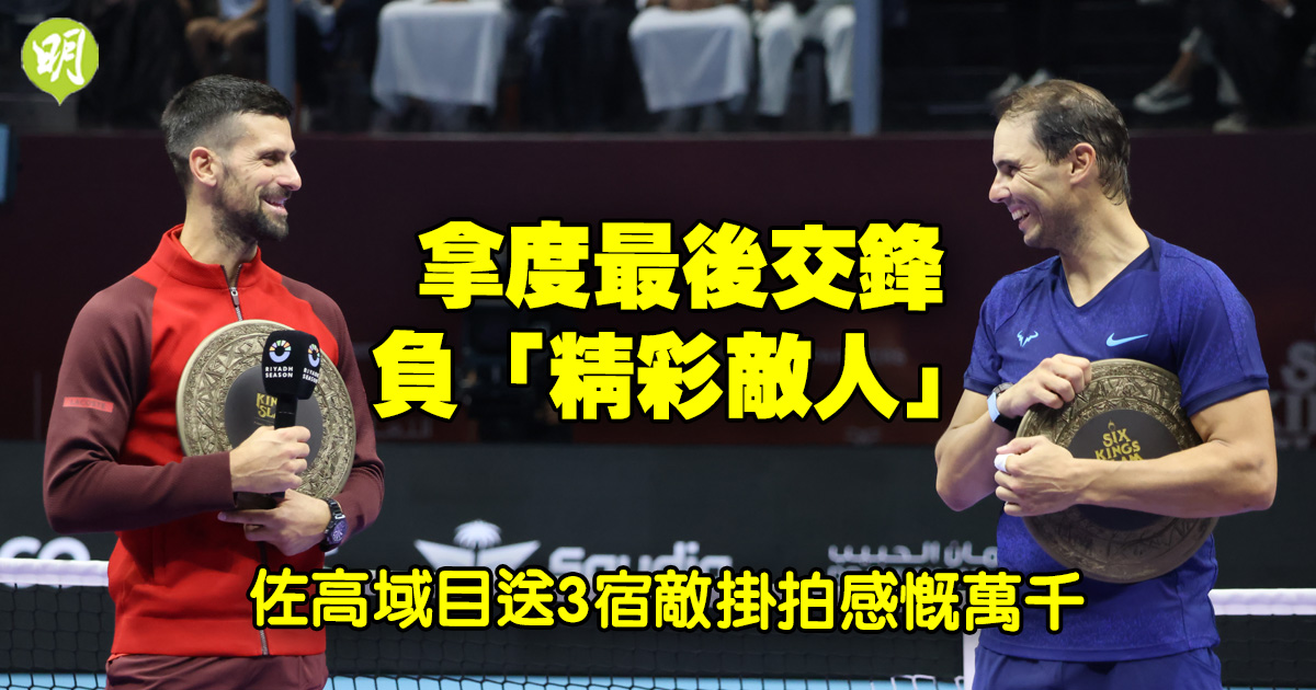 西班牙籍名將拿度今晨(20日)在沙特阿拉伯首都利雅得舉行的「六王大滿貫」表演賽季軍戰,以2:6、6:7(5:7)不敵塞爾維亞籍的佐高域後,稱讚很可能是最後一次交手的對方是「精彩的敵人」,佐高域則為已先後目送名宿瑞士籍的費達拿和英籍的梅利掛拍而感慨萬千,並要求拿度「不要離開網球」。
