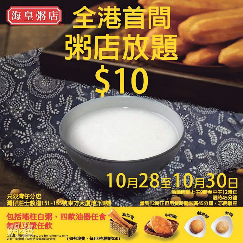 【明報專訊】話說近期港人北上或者出國外遊成風,有本地粥舖海皇粥店喺facebook宣布下星期一至三,推出10元放題奇招活動,畀食客喺45分鐘內任食白粥、豆漿同埋油器,海皇粥店嘅小編喺放題活動文章仲提到,「香噴噴嘅白粥配埋脆卜卜嘅油條,再配埋一啖香滑豆漿!咁樣嘅早餐組合,就算係日日食都唔會厭」,仲叫人一齊去海皇粥店「大快朵頤」。
