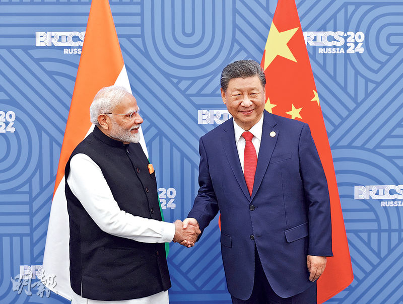 【明報專訊】中印就邊境問題達成解決方案後,國家主席習近平昨日下午與印度總理莫迪在金磚峰會期間舉行雙邊會談。這是兩人相隔5年後首次會晤。習近平表示,中印應加強合作,妥善處理矛盾分歧。