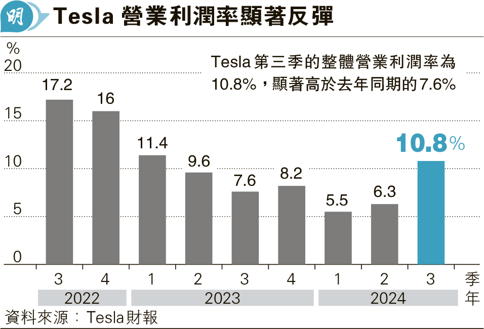 【明報專訊】特斯拉(Tesla)(美:TSLA)利潤連跌兩季後,出乎意料強勁反彈,第三季利潤按年大增17%至22億美元。備受關注的整體營業利潤率為10.8%,顯著高於去年同期的7.6%。Tesla最新預計今年全年交付量將略高於去年的181萬輛。Tesla行政總裁馬斯克更預期明年電動車銷售將增長20%至30%。最新季績及銷售指引反映Tesla核心的電動車業務盈利正改善,且銷售有望顯著增長,刺激其股價昨早段急升17%,彌補了今年以來所有跌幅。截至周三收市,該股今年以來跌14%。