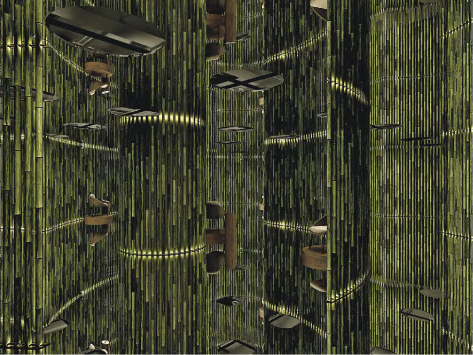 「香港設計延館」的策展團體是香港跨領域設計公司「Lim+Lu 林子設計」。公司共同創始人林振華(Vincent)和盧曼子(Elaine)以竹林為概念,在整個藝術展亭的二樓豎起一根根竹子,形成自然流動的弧度,走在裏頭彷彿置身竹林之中,微微竹香撲鼻而來。Vincent解釋:「當要辦一個香港的設計展覽時,我們便思考什麼是香港本土,我們立刻想到竹棚架在香港很有標誌性,因為在香港長大,我一直都覺得竹棚架很迷人(fascinating),我認為香港可能是最後一個仍然使用竹棚架的城市。」Elaine亦補充,他們在展場內沿用反光地板和天花板,試圖創造出一個無限竹林,「觀眾迷失在這蜿蜒的竹林迷宮中,他們可以自行探索,用自己的方式、順序看展品」。另外,「香港設計延館」將會在同月7日完結,與「米蘭衛星設計收藏二十五週年展」的開幕只有3日間隙,竹能輕鬆組裝和拆卸,亦是Vincent和Elaine以竹為設計背後的小巧思。