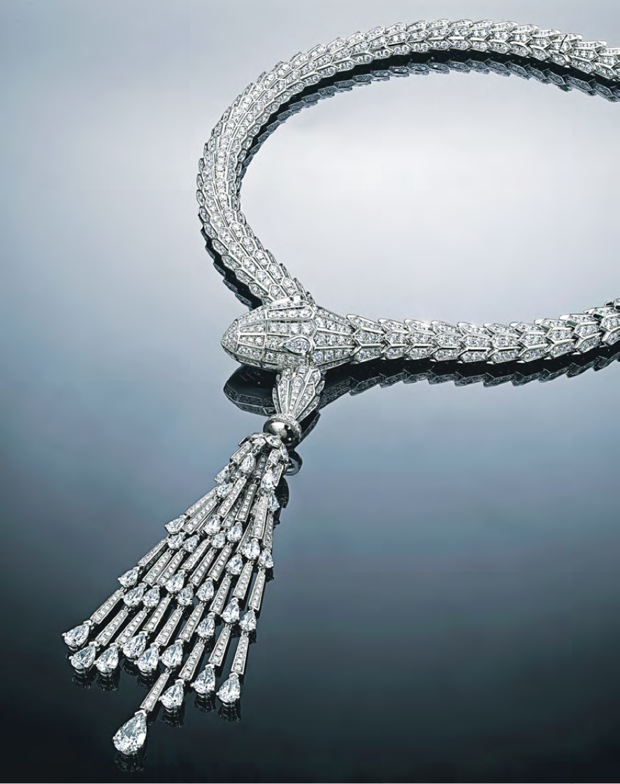 幾乎每個品牌都有自己的吉祥物,而Bvlgari的代表動物是靈蛇。拍賣行表示,蛇在某些文化中視為生育繁殖的象徵,代表強壯、永恆和誘惑。品牌源自希臘和羅馬地區,1930年代起在國際備受關注,鑲有貴重寶石的奢華珠寶吸引各地王室和富有人家追捧。在1940年代後期,品牌開創極具風格的繞圈蛇形珠寶款式,經常以蛇為主題推出Serpenti頸鏈,頸鏈修長的形狀讓設計師展現出蛇的修長體態。品牌其中一個賣點是開創採用多種色彩組合並使用大膽設計風格的「宣言珠寶」(statement jewellery);設計方向是把焦點放在視覺效果多於寶石的本身價值,並且多數由彩色寶石擔正,鑽石在設計中只是配角。今次上拍的「靈蛇」色彩相對低調,以鑽石為主,十分難得。以淺色為主調的蛇設計不帶半點殺氣,它沒有眼睛和口的造型,帶點和平和溫馴的感覺。