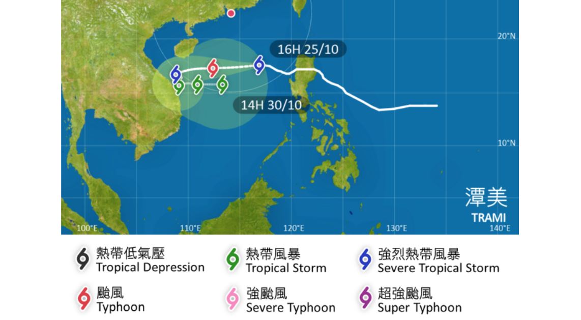 天文台:潭美明早香港以南500公里掠過 一號戒備信號至少維持至明早6時 (15:58)