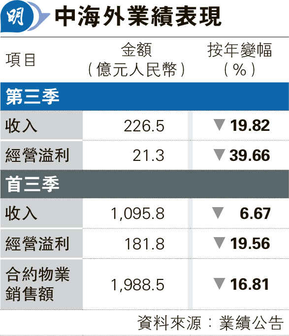 集團續指出,行業下行轉折期,公司戰略篤定、財務穩健、資金充裕,貨量結構優異,在政策利好的加持下,有信心在行業大變局塑強競爭優勢,保持穩健、可持續的高質量發展。中海外昨午公布第三季業績,收市跌1.48%,報14.6元。