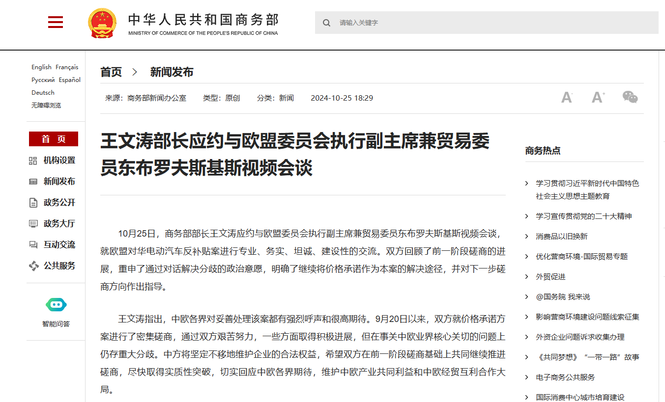 中國商務部部長王文濤10月25日應約與歐盟委員會執行副主席兼貿易委員東布羅夫斯基斯舉行視像會談,雙方明確了繼續將價格承諾作為歐盟對華電動汽車反補貼案的解決途徑,並對下一步磋商方向作出指導;歐方亦就價格承諾方案提出具體建議,詳情官方未披露。