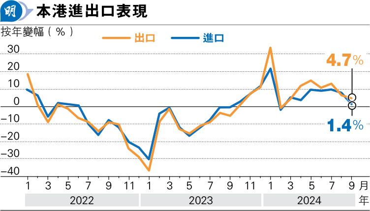 【明報專訊】政府統計處公布9月香港對外商品貿易統計,進出口貨值增幅均較8月放緩,與內地進出口趨勢一致。9月整體出口貨值按年上升4.7%,低於市場預期的6.6%,較8月增速放緩1.7個百分點;進口貨值按年上升1.4%,低於市場預期的2.2%,較8月增速大幅下降6.5個百分點。政府發言人表示,展望未來貿易磨擦升溫和環球經濟不明朗因素,可能繼續影響香港出口表現,不過內地經濟前景改善,應會帶來一些支持。