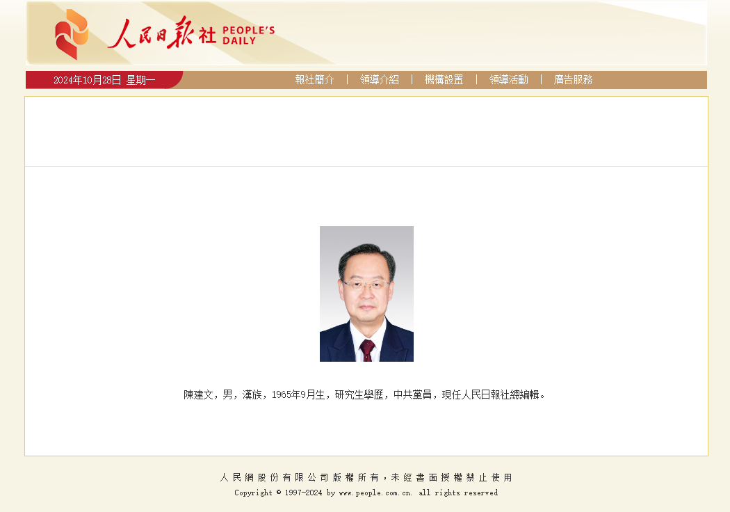 據人民日報社官網10月28日最新顯示,前廣東省委宣傳部長陳建文已出任人民日報社總編輯。
