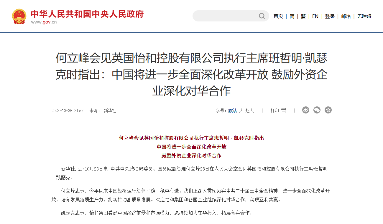 即時兩岸 何立峰會見怡和執行主席 籲繼續深化對華合作 (21:47) 發佈於 1 年 前 2024 年 10 月 28 日 By 明報 國務院副總理何立峰10月28日在北京人民大會堂會見英國怡和控股有限公司執行主席班哲明·凱瑟克。 何立峰表示,今年以來中國經濟運行總體平穩、穩中有進;歡迎怡和集團和各國企業繼續深化對華合作,實現互利共贏。 凱瑟克表示,怡和集團看好中國經濟前景和市場潛力,願持續加大在華投入,拓展務實合作。(新華社) 相關文章:中英何立峰怡和 Up Next 浙江省長王浩升任省委書記 易煉紅卸任 (19:22) 不要錯過 國務院辦公廳發文強化生育服務支持 (22:59) 繼續閱讀 贊助商 猜你喜歡 何立峰:中美應為兩國經貿關係打開新的合作空間 (20:38) 何立峰同法國經濟部長萊斯屈爾舉行視像通話 (22:40) 何立峰:港完善全球金融治理具優勢 冀更好發揮橋樑作用 對接「十五五」規劃 中美經貿談判將於大馬舉行 何立峰明率團赴會 (16:10) 何立峰貝森特通話 同意盡快舉行中美經貿磋商 貝森特:雙方下周會面 (10:16) 華索TikTok「補償」 美未允撤關稅 特朗普:已達協議允續營運 美多大企想收購
