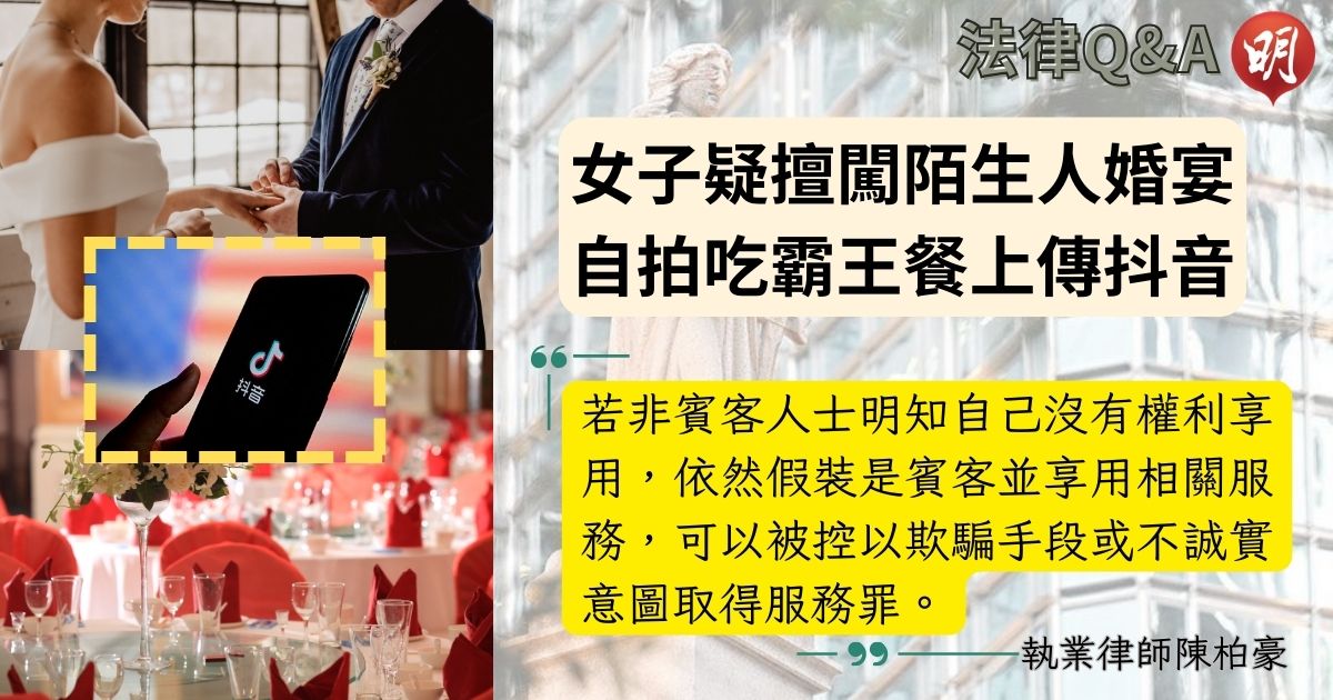 近日有媒體報道,有操普通話的女子疑在香港闖入陌生人的婚宴,她被指在沒有支付「人情」下享用婚宴的食物,並拍下碟上的菜式,以及一對新人在婚禮上情況,再上傳到社交平台抖音。涉事婚禮的新娘事後接受網媒ChannelC訪問,稱與新郎均不認識該名女子。事件惹來網民熱論,認為該女子犯下偷竊罪。CPH Legal執業律師陳柏豪接受明報電子平台組訪問時表示,若事件屬實,該女子或涉及以欺騙手段或不誠實意圖取得服務罪。
