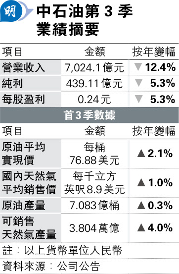 中石油指出,今年首3季國際原油價格先升後跌,保持中高位水平,集團期內原油價格為每桶76.88美元,較去年同期的75.28美元升2.1%;國內天然氣平均銷售價格為每千立方英尺8.9美元,按年升1%。按業務分部計,油氣和新能源分部首3季經營利潤增長8.7%至1442.62億元;煉油業務經營利潤減少57.4%至117.81億元;化工業務經營利潤大增25.7倍至34.99億元。