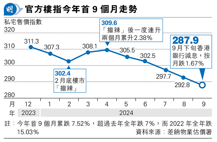 【明報專訊】本港樓價仍未止跌回升,差餉物業估價署最新公布上月私宅售價指數287.9點,按月跌1.67%,與8月跌幅1.65%相若,並連跌5個月,累跌7.52%,已超過去年全年約7%跌幅,並為2016年8月後8年新低。不過,有關數字未完全反映上月下旬減息對樓市的影響,以及本月新一份《施政報告》公布後新盤銷情熾熱的市况。