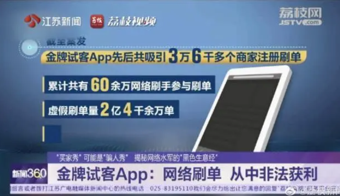 報道指出,「金牌試客」App共吸引36,000多個商家會員註冊「刷單」,累計60餘萬網絡「刷單手」(網絡水軍範疇)參與「刷單」,虛假「刷單」量2億4000餘萬單,交易金額約47億元(人民幣,下同)。不到3年時間,「金牌試客」App從中獲利4000多萬元。