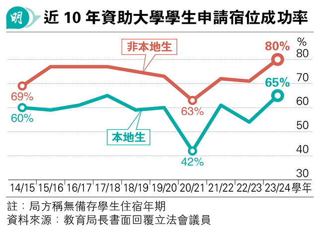 【明報專訊】隨着政府推動更多非本地生來港升學,宿位短缺問題備受關注。教育局長蔡若蓮昨日書面回覆立法會議員,交代本港8間資助大學的宿位安排,其中非本地生申請宿位成功率至少連續10年高於本地生,以上學年(2023/24)為例,非本地生80%成功申請,本地生則為65%。局方稱各大學可自訂宿位安排,一般不限入住年期,盼院校維持靈活,確保學生宿舍資源運用得宜。