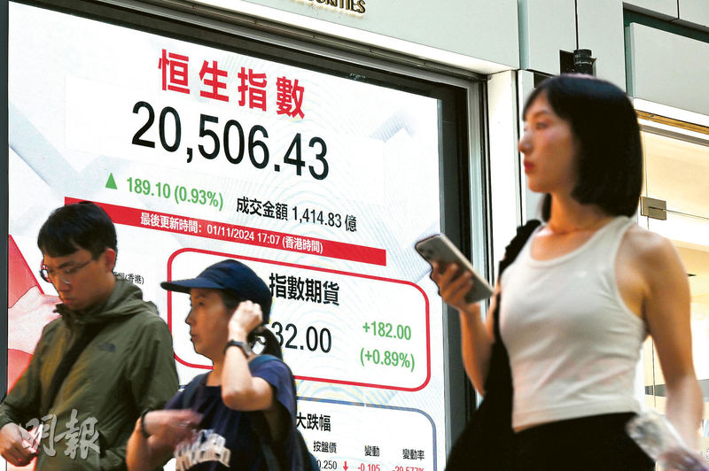 【明報專訊】隔晚美股走低,但繼官方數據後,財新內地10月製造業PMI亦重返擴張水平兼勝預期,憧憬刺激經濟政策效果開始顯現,恒指在重磅內地科技股帶動下曾升最多350點,見20,667點,惟恒指最終升幅收窄至0.9%或189點,收報20,506點。港股未擺脫「陰乾」情况,三大指數已經連跌4周。大市成交額比周四再縮約8.35%,至1415億元,南向資金續捧場,昨天淨買入42.53億元。全周計,恒指累跌0.41%,國指累跌0.58%,科指更累跌1.19%。