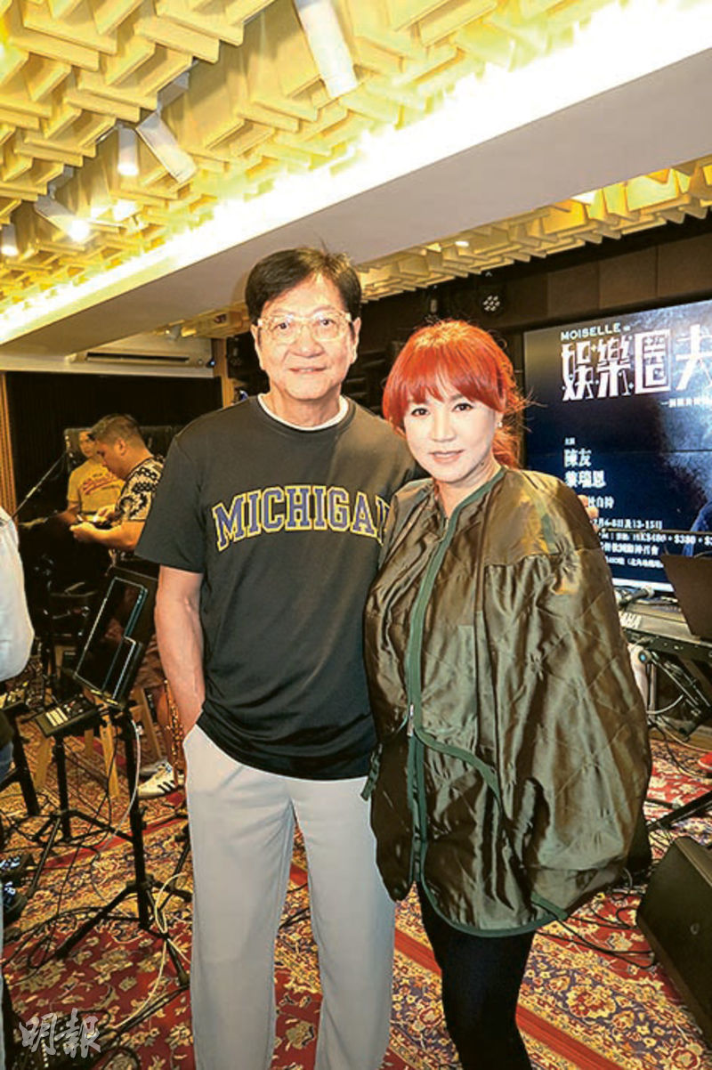 【明報專訊】陳友、黎瑞恩(小恩子)及張武孝(大AL)前晚為12月公演的音樂劇《娛樂圈夫人》綵排。陳友與大AL輪住忘記歌詞,小恩子笑說:「會唔會傳染輪到我不記得歌詞。」她最終沒出錯順利完成。陳友表示第二日綵排,距離演出還有一個月,有信心到時不會發台瘟。問小恩子會否擔心演出時發台瘟?她表示擔心,因要獨唱七八首歌,又唱又跳很大挑戰,現在最重要將歌詞和對白背熟。陳友稱是live band,他們到時若忘記歌詞,樂隊會幫他們兜。