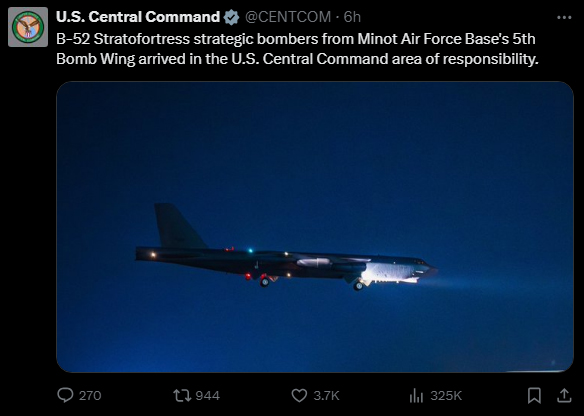 即時國際 美軍稱B-52轟炸機已抵中東 (13:01) 發佈於 12 個月 前 2024 年 11 月 3 日 By 明報 美國軍方上周六(2日)表示,美軍B-52長程轟炸機已抵達中東。美國前日宣布再調整軍事資產,增派B-52長程轟炸機、戰機、加油機及驅逐艦前往中東,在伊朗與以色列針鋒相對地空襲之際向伊朗示警。(法新社) 中東局勢:以軍大舉空襲入侵 黎南近1/4建築被毁 相關文章:B-52轟炸機中東中東局勢以軍大舉空襲入侵 黎南近1/4建築被毁美軍 Up Next 印尼東部火山爆發 7村莊受影響釀最少10死 (14:01) 不要錯過 英留學生鐵鎚襲3師生判終身監禁 法官解除身分保護揭是大馬富家子 (15:50) 繼續閱讀 贊助商 猜你喜歡 聯國譴責美軍炸運毒船 「法外處決」涉違國際法 委總統爭取中俄伊軍援 防美襲本土 美航母軍艦陸續集結加勒比海 特否認出兵未息疑慮 樂舒適引入15基投 明略暗盤升逾倍 稱美臨「內戰」 特促軍隊對付「內敵」 美軍首在韓部署「死神」無人機 被指監視中朝 (20:35) 美罕見召回全球800高級軍官開會