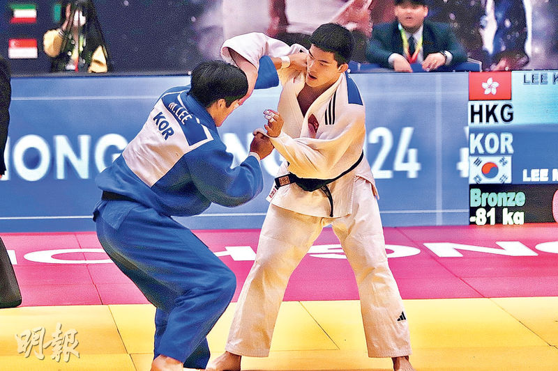 【明報專訊】一連兩天的亞洲柔道公開賽香港站昨於馬鞍山體育館煞科,港將李玨穎雖在男子81公斤以下級別復活賽獲「一本」並躋身銅牌戰,但迎韓籍選手李明瑞(Lee Myeongseo)時累積3次「指導」領紅無緣獎牌。總計今屆賽事港隊以1銀3銅收官。
