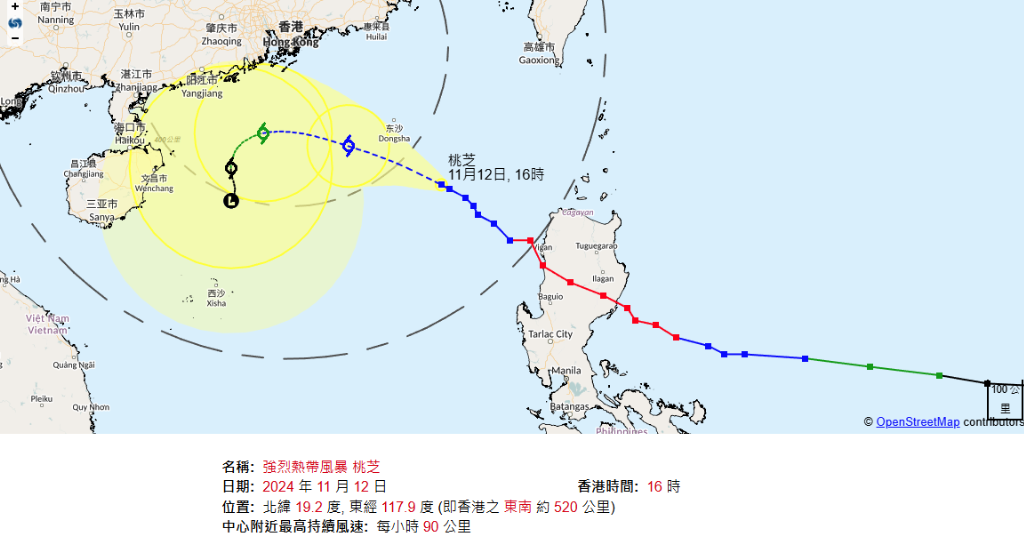 預料桃芝在周四(14日)早上於本港以南200公里左右掠過。天文台會視乎屆時桃芝的強度、其烈風區與珠江口的距離及本地風力變化,評估是否需要改發更高熱帶氣旋警告信號。