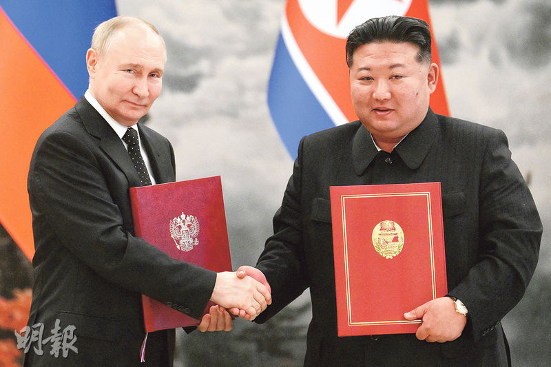 俄羅斯總統普京今年6月訪問平壤期間,與金正恩簽署了《全面戰略伙伴關係條約》,提到兩國有義務在對方遭受攻擊時「立即」提供軍事援助,並進行國際合作以抗衡西方制裁。俄羅斯國會上周一致表決通過協議,並由普京將協議簽署成法。朝中社報道,朝鮮國元首周一(11日)簽署了相關政令,這項協議「作為(金正恩的)政令已獲批准」,「協議將從雙方交換批准書之日起生效」。