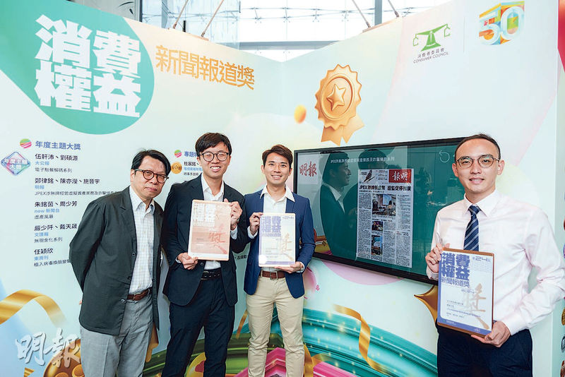 【明報專訊】消委會噚日舉辦「第24屆消費權益新聞報道獎」頒獎禮,明報奪得兩獎,其中記者李大煒憑「電話促銷系列」偵查報道獲專題特寫獎銅獎,該報道探討電話滋擾氾濫,本地電話服務業「轉軚」希望立法規管。記者陳亦瀅、鄭律銘同施晉宇嘅「綠石數字資產平台涉無牌經營虛擬資產業務及詐騙偵查系列」則獲頒「年度主題大獎」最後五強;今屆大獎主題係「創新科技應用對消費者影響」,本報系列率先揭露JPEX涉違規在港宣傳及經營,屬近年最大宗懷疑詐騙案。