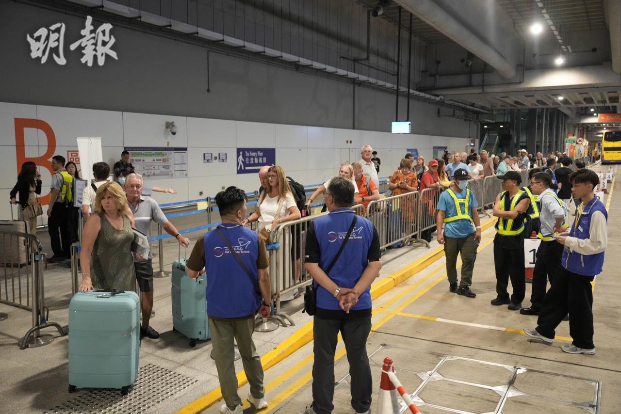 首批落船旅客近7時步出抵港大堂,美國遊客Mark及Sue今早約7時已下船,惟約一小時才登上的士離開,造成不便,Mark認為他們抵達時應該已有的士在站內輪候,Sue亦稱其他地方的郵輪碼頭,通常都有的士已在站內等候乘客,香港的碼頭亦應如此。被問到會否考慮其他交通選擇,她說因為下雨及酒店離巴士站較遠故不會考慮,穿梭巴士要9點才開始服務「亦是問題」,在場候車時間只會更長,故亦未考慮;來自法國的遊客Graga及Susan因行李多而選搭的士,最終等候至少半小時才登車。Susan認為站內看似不夠的士(doesn’t seem to be many taxi)。