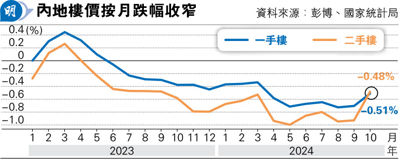 【明報專訊】內地政府推出穩定樓市措施效果漸顯,國家統計局公布10月份內地70個城市樓價數據,彭博計算新建商品住宅樓價按月跌0.51%,跌幅為今年3月以來最小。國家統計局城市司首席統計師王中華指出,10月一線城市新樓售價按月跌0.2%,跌幅比9月收窄0.3個百分點,其中,上海和深圳更分別按月回升0.3%和0.1%,而北京和廣州則按月均跌0.7%,二線城市新樓售價按月跌0.5%,跌幅比9月收窄0.2個百分點。