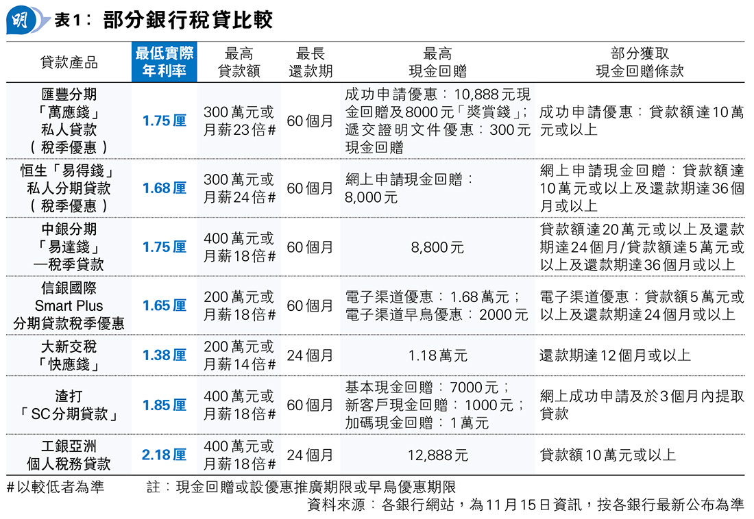 銀行在宣傳稅貸時,一般會以該稅貸可提供的最低實際年利率招徠客戶。是次比較的稅貸中,大新交稅「快應錢」包括現金回贈後的實際年利率可低至1.38厘(見表1),此實際年利率以該行特惠客戶貸款199萬元,每月平息0.1115厘、還款期12個月及包括1.18萬元現金回贈計算,而同一借貸額及還款期下,不包括現金回贈的最低實際年利率則提升至2.49厘,因此若實際年利率已計入現金回贈,應了解獲取現金回贈的相關條款。