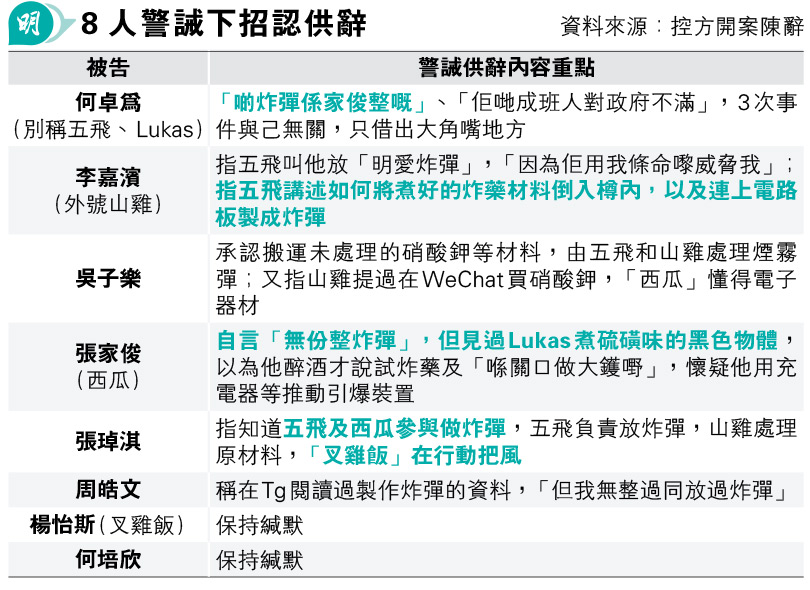 被告為何卓為、李嘉濱、吳子樂、張家俊、楊怡斯、張琸淇、何培欣及周皓文。首7名被告被控《反恐條例》下的串謀爆炸罪,李嘉濱另被控妨礙司法公正罪,周皓文被控企圖製造炸藥罪。