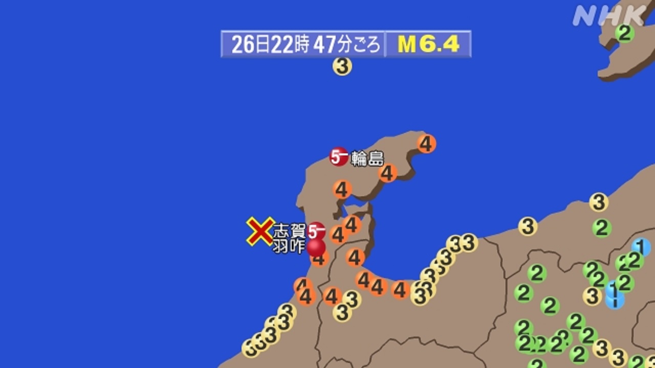 日本石川縣西部近海地區周二(26日)晚10點47分(香港時間晚上9時47分)左右發生6.4級地震,震源深度10公里,當局沒有發出海嘯警報。